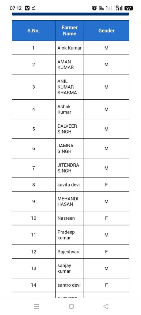 - जैसे ही आप Get Report के बटन पर क्लिक करते है आपके सामने आपके गांव के किसान लाभार्थी के नाम की लिस्ट शो हो जायेगी।